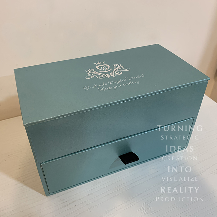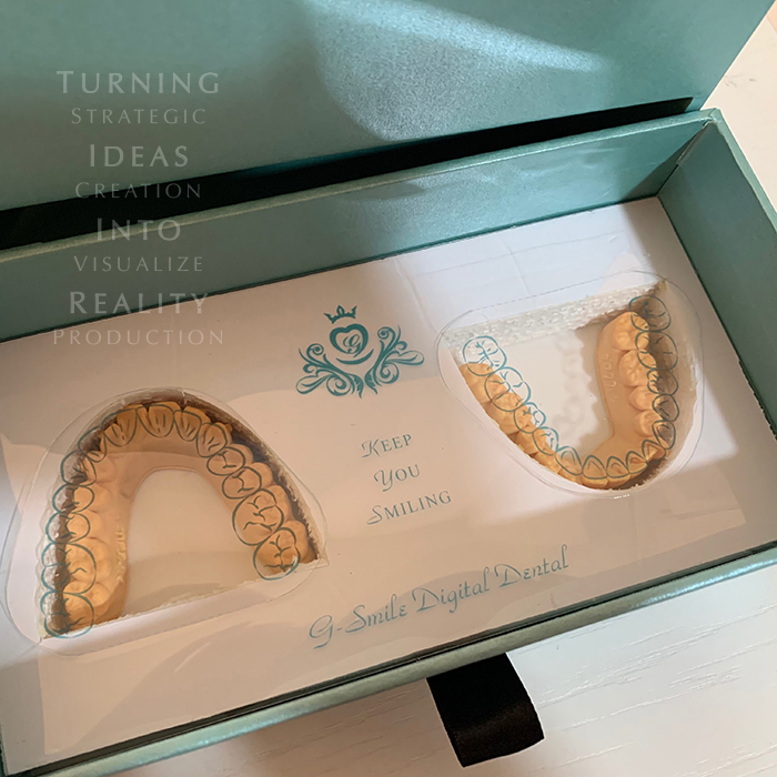 這件組合裡面包含了一組協助矯正的齒列震動器,患者原始的牙模-讓她記住自己原來的樣子。2組最新的隱形牙套以及1組牙套盒,另外還會附上一張說明書,載明這個療程預計會有多少副牙套,患者需要配合的事情有哪些,整組配件以精裝抽屜盒的方式呈現。
